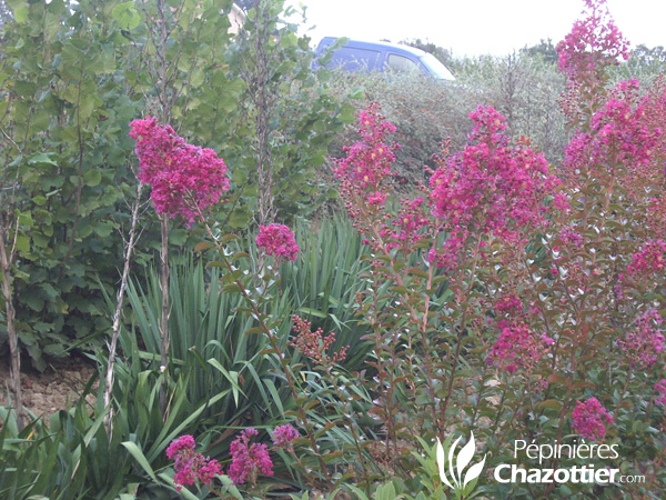 Arbuste à feuilles caduques rondes et à faible végétation mais pouvant atteindre 3 à 4 m de haut démarrant très tard au printemps donne une superbe floraison rose fuchsia qui s'assombrit au cours de l'été. Ses fleurs en épi terminaux, s'épanouissent chez nous en principe vers la mi août et persistent un bon mois. Florissant sur le bois de l'année, le Lagerstremia a besoin, tout du moins dans les premières années de plantation d'être taillé au printemps pour permettre l'arrivée de pousses nouvelles vigoureuses. En cas d'été pluvieux cette floraison peut avoir du mal à s'épanouir c'est pour cela que nous conseillons de choisir une exposition bien ensoleillée.